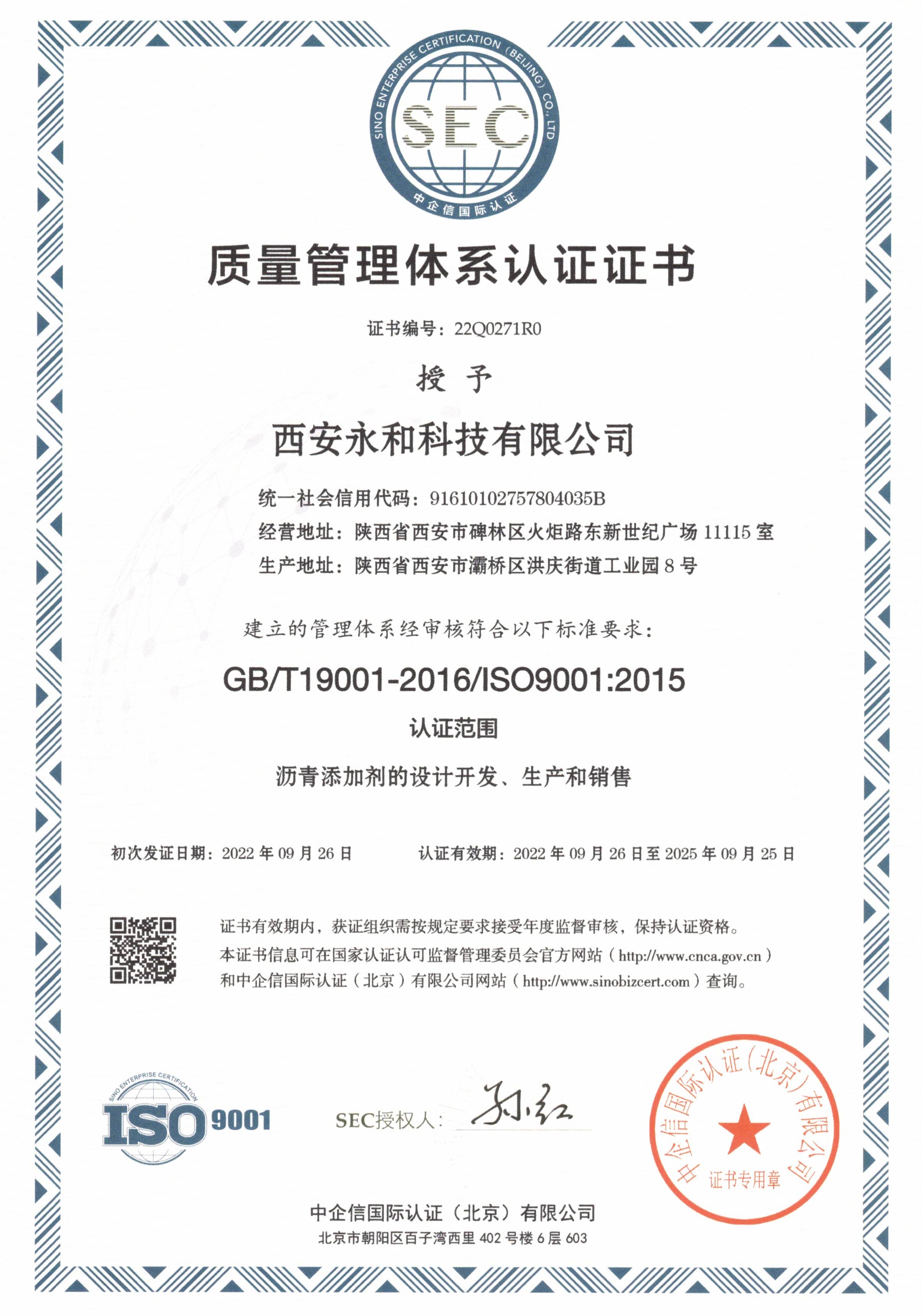熱烈祝賀“西安永和科技有限公司”在2022年9月26日通過質(zhì)量管理體系認(rèn)定。